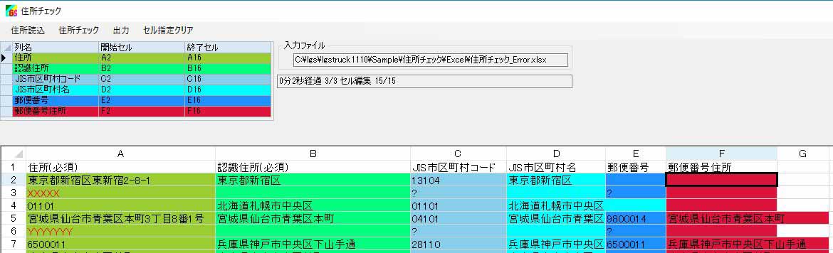 エクセルで読み込ませた住所データについて、「認識住所」とJIS市区町村コード、JIS市区町村名、郵便番号、郵便番号住所を表示します。