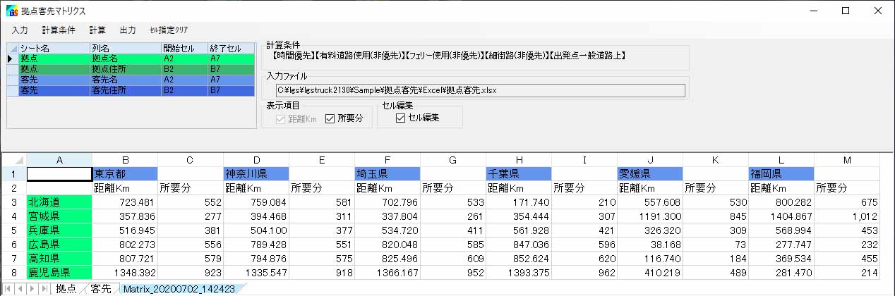 Excelシートをそのまま読込み、起点住所列・終点住所列・積載重量列を指定し、距離運賃計算ができます。計算結果は Excel・CSV ファイル出力できます。