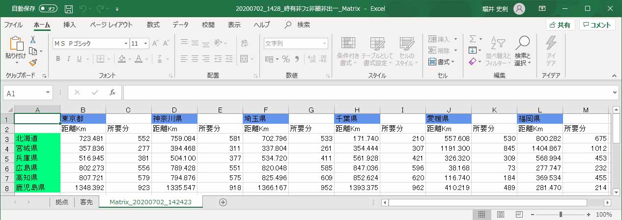 | (5)拠点客先マトリクス作成 | 複数拠点の 自社x顧客 間の距離・移動時間のマトリクスを作成します。 |