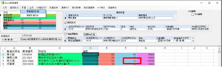 Excelシートをそのまま読込み、起点住所列・終点住所列・積載重量列を指定し、距離運賃計算ができます。計算結果は Excel・CSV ファイル出力します。